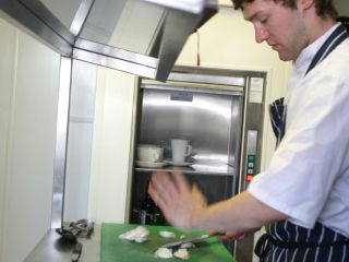 The dumbwaiter service lift has been installed to make the best use of the three floor premises, without compromising the quality of customer service. The lift goes from the working kitchen on the upper floor to the ground and lower ground floor serving areas below. The lift shaft is totally glass so the travelling lift car can be seen within.