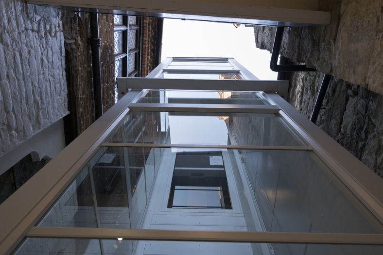 The 23 individual glass panels and panoramic, fully glazed doors at each level allow the lift to meld with its environment whilst simultaneously showcasing the period features to visitors as they travel a total distance of 3900mm.