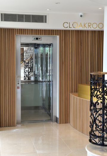 The 8-person Maxilift is located in the ground-level marble entrance foyer, to the left of a grand, curved staircase flanked by black and gold wrought iron balustrades. Presented in a natural wood fascia, it welcomes visitors of all mobility levels and escorts them between two floors of comprehensive hospitality facilities.