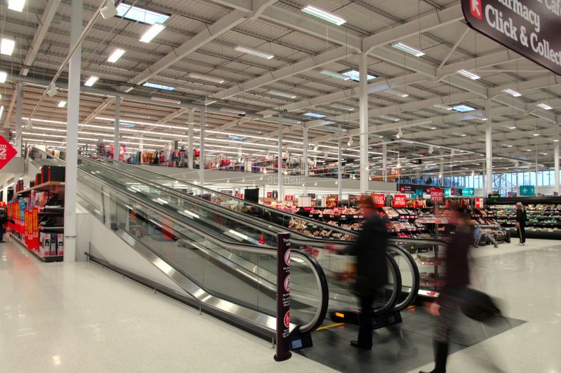 The moving walkways operate between the ground-floor entrance area and food hall and first-floor clothing, café, pharmacy and click and collect. They deliver secure, efficient movement for shoppers and their trolleys over a vertical rise of 4250mm at a 10o angle, and at rated speed of 0.5ms. For those unable to use the walkways, store access is further complemented by a passenger lift.